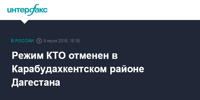 "Режим КТО в Карабудахкентском районе Дагестана отменен в 18:00 пятницы. Спецмероприятия по выявлению и ликвидации участников бандподполья завершены", - сказал собеседник агентства.