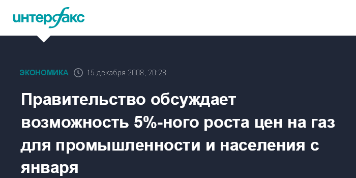 Москва. 15 декабря. INTERFAX.RU - Правительство РФ обсуждает возможность 5%-ного роста цен на газ, поставляемый ОАО "Газпром", как для промышленности, так и для населения с 1 января, сообщил "Интерфаксу" источник в профильном ведомстве.