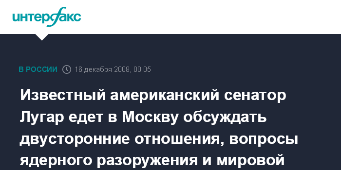 Вашингтон. 16 декабря. ИНТЕРФАКС - Будущее российско-американских отношений, нынешний мировой финансовой кризис, вопросы разоружения обсудит в ходе визита в Москву 16-20 декабря известный сенатор- республиканец Ричард Лугар.