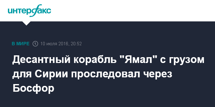 Москва. 10 июля. INTERFAX.RU - Большой десантный корабль Черноморского флота "Ямал" в воскресенье, направляясь с грузом в Сирию, прошел через черноморские проливы в акваторию Средиземного моря, сообщили местные информационные порталы, публикующие фотографии его прохождения через Босфор.