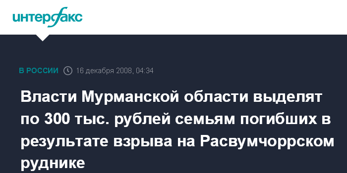 Мурманск. 16 декабря. ИHТЕРФАКС СЕВЕРО-ЗАПАД - В Мурманской области 16 декабря объявлено Днем траура в связи с трагическими событиями на Расвумчоррском руднике ОАО "Апатит".