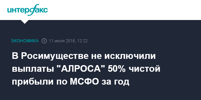 Москва. 11 июля. INTERFAX.RU - Норма о выплате "АЛРОСА" в качестве дивидендов 50% от чистой прибыли по МСФО может быть пролонгирована на 2016 год, заявил глава Росимущества Дмитрий Пристансков на церемонии завершения сделки по приватизации госпакета в понедельник.