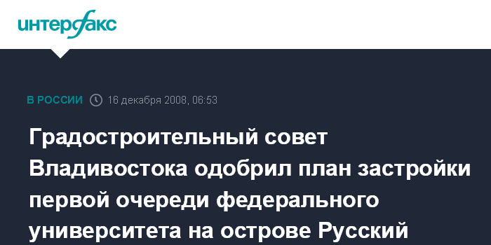 Владивосток. 16 декабря. ИНТЕРФАКС-ДАЛЬНИЙ ВОСТОК - Градостроительный совет Владивостока утвердил план застройки первой очереди Дальневосточного федерального университета (ДВФУ) на полуострове Саперный острова Русский, который появится на месте объектов, построенных к саммиту АТЭС-2012.