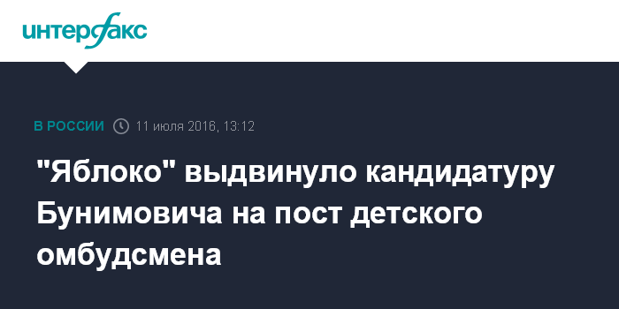 Москва. 11 июля. INTERFAX.RU - Партия "Яблоко" предложила на пост уполномоченного при президенте РФ по правам ребенка московского детского омбудсмена Евгения Бунимовича.