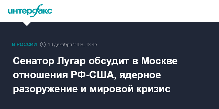 Москва. 16 декабря. INTERFAX.RU - Будущее российско-американских отношений, нынешний мировой финансовой кризис, вопросы разоружения обсудит в ходе визита в Москву 16-20 декабря известный сенатор-республиканец Ричард Лугар.