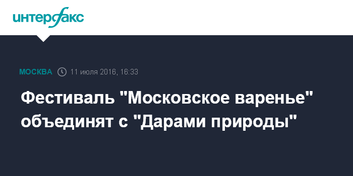 Москва. 11 июля. INTERFAX.RU - Фестивали "Московское варенье" и "Дары природы" решено объединить из-за схожести по тематике, сообщает официальный портал мэра и правительства Москвы.