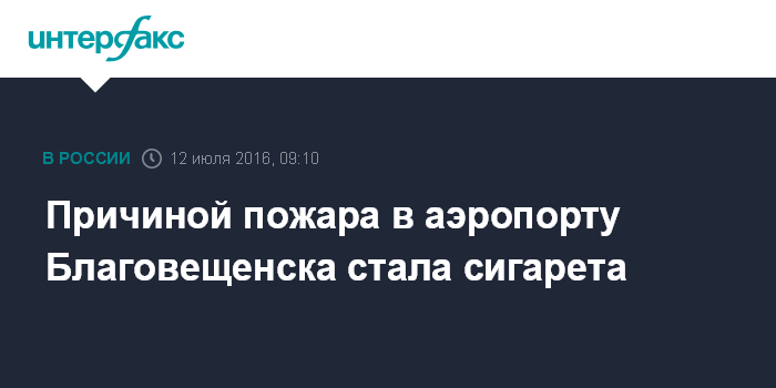 Москва. 12 июля. INTERFAX.RU - Непотушенная сигарета, по официальному заключению экспертов, стала причиной пожара в Благовещенском аэропорту (Амурская область), который уничтожил часть обшивки здания и оконные проемы.