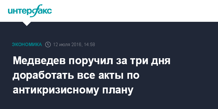 Москва. 12 июля. INTERFAX.RU - Премьер-министр РФ Дмитрий Медведев поручил ведомствам в трехдневный срок доработать все нормативные документы, необходимые к принятию в рамках реализации антикризисного плана, сказал первый вице-премьер Игорь Шувалов журналистам по итогам совещания о ходе реализации плана действий правительства по стабильному социально-экономическому развитию РФ на 2016 год.