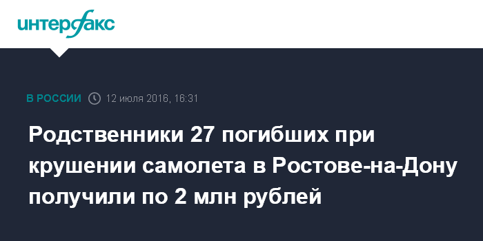 Москва. 12 июля. INTERFAX.RU - Родственники 27 россиян, погибших при крушении самолета авиакомпании flydubai в ночь на 19 марта в аэропорту Ростова-на-Дону, получили предварительные компенсации в размере 2,025 млн рублей, сообщается в пресс-релизе Всероссийского союза страховщиков (ВСС).