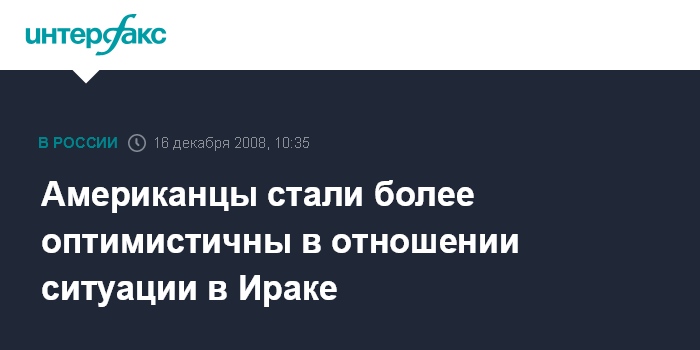 Москва. 16 декабря. INTERFAX.RU - В настоящее время уровень оптимизма американцев в отношении ситуации в Ираке самый высокий за последние пять лет, показывает опрос, проведенный газетой "Вашингтон пост" и телеканалом Эй-Би-Си.