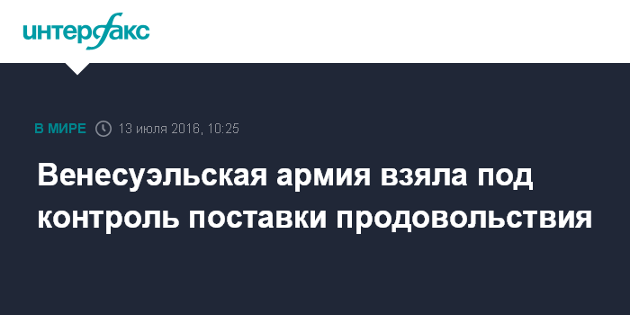 Москва. 13 июля. INTERFAX.RU - Армия Венесуэлы взяла под контроль порты и предприятия пищевой промышленности, чтобы обеспечить поставки населению продовольствия и медикаментов, передает "Би-би-си".