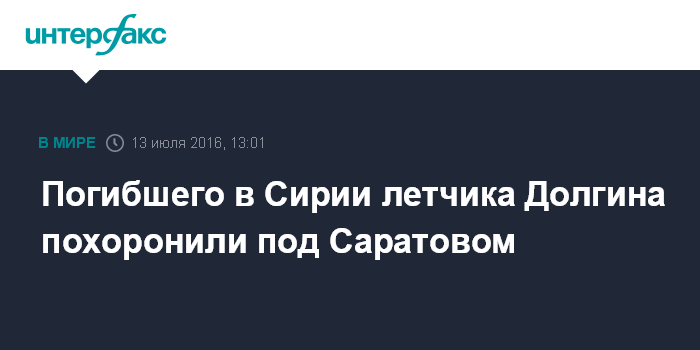 Москва. 13 июля. INTERFAX.RU - Церемония прощания с военным летчиком Евгением Долгиным, погибшим в районе сирийской Пальмиры, прошла в среду в Саратовской области.