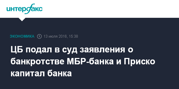 Москва. 13 июля. INTERFAX.RU - Банк России 11 июля подал в Арбитражный суд Москвы заявления о банкротстве московских Межрегионального банка реконструкции (МБР-банк) и Приско капитал банка, говорится в материалах суда.