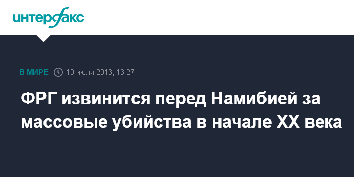 Москва. 13 июля. INTERFAX.RU - Власти Германии планируют принести извинения Намибии за массовые убийства представителей народов гереро и нама, совершенные Германской империей в этой африканской стране в 1904-1908 гг., пишет в среду немецкий еженедельный журнал Der Spiegel.