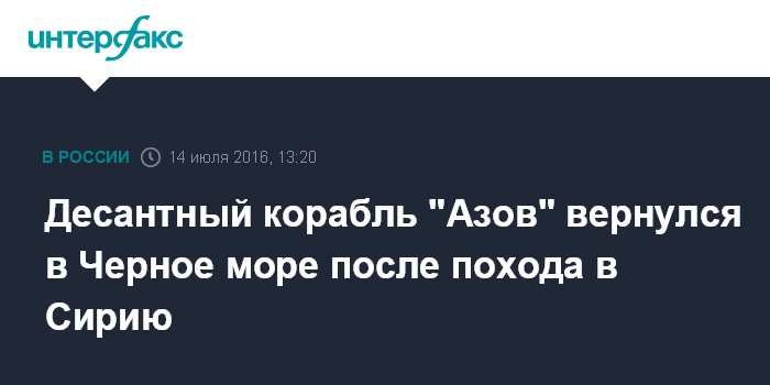 Москва. 14 июля. INTERFAX.RU - Большой десантный корабль Черноморского флота "Азов" в четверг вернулся в Черное море, совершив четвертый в 2016 году поход в Сирию. Об этом сообщили местные информационные порталы, публикующие фотографии его прохождения через пролив Босфор.