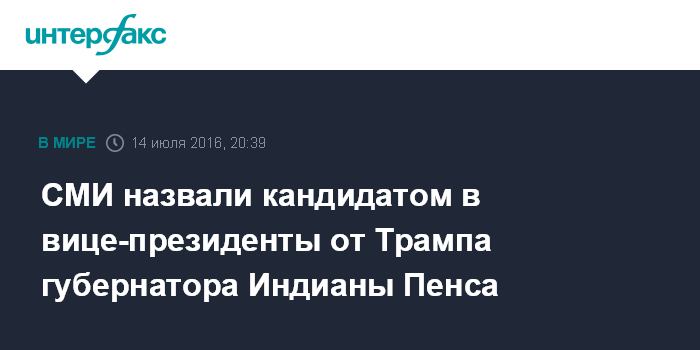 Как сообщалось, помимо губернатора Индианы, на участие в борьбе за пост вице-президента претендуют, в частности, губернатор Нью-Джерси Крис Кристи и экс-спикер палаты представителей Ньют Грингрич. Кроме того, в шорт-лист, по данным американских СМИ, попал отставной генерал Майкл Флинн, который в прошлом руководил военной разведкой США.
