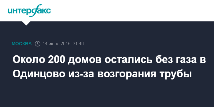 Москва. 14 июля. INTERFAX.RU - Возгорание газовой трубы, поврежденной в результате строительно-монтажных работ в четверг, ликвидировано в подмосковном Одинцово, 200 домовладений остаются без газоснабжения, сообщили "Интерфаксу" в пресс-службе зампреда правительства Московской области Дмитрия Пестова.