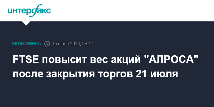 FTSE повысит вес акций "АЛРОСА" после закрытия торгов 21 июля