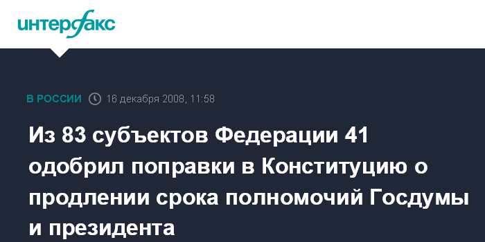 Из 83 субъектов Федерации 41 одобрил поправки в Конституцию о продлении срока полномочий Госдумы и президента