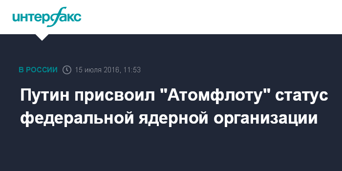 Москва. 15 июля. INTERFAX.RU - Президент РФ Владимир Путин своим указом присвоил ФГУП "Атомфлот" статус федеральной ядерной организации на 25-летний срок.