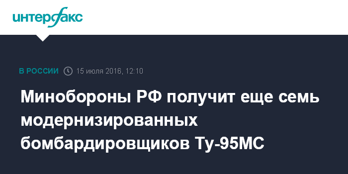 Москва. 15 июля. INTERFAX.RU - Минобороны РФ получит еще семь модернизированных стратегических бомбардировщиков-ракетоносцев Ту-95МС, в дополнение к одному уже переданному, заявил генеральный директор ПАО "Туполев" Александр Конюхов.