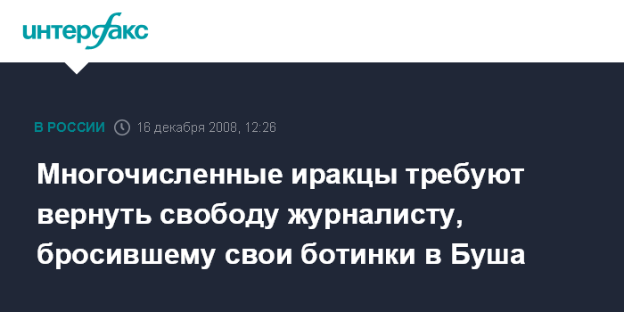 Москва. 16 декабря. INTERFAX.RU - Как шииты, так и сунниты в Ираке призывают освободить из-под стражи иракского журналиста Мунтазира аз-Зейди, кинувшего свои ботинки в президента США Джорджа Буша во время его недавнего визита в Ирак, пишет во вторник британская газета "Таймс".
