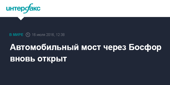 Москва. 16 июля. INTERFAX.RU - Автомобильное движение на мосту через пролив Босфор в Стамбуле возобновлено в обоих направлениях после завершения работ по очистке территории, сообщают турецкие СМИ.