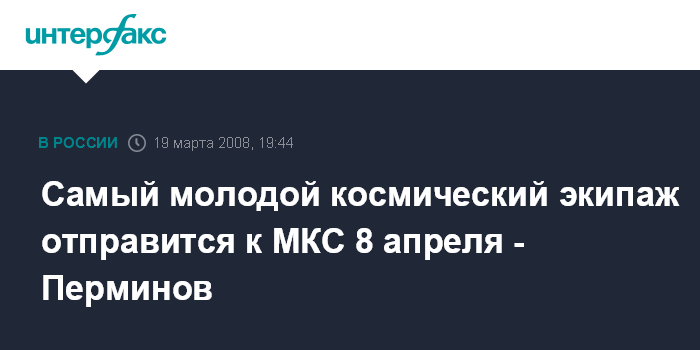 "Единственное отличие от предыдущего экипажа состоит в том, что впервые на МКС летит молодежь. За четыре года, во время которых мы отправляли экипажи на международную космическую станцию, это самый молодой экипаж", - сказал А.Перминов после встречи с новым экипажем МКС, который отправится на орбиту 8 апреля.