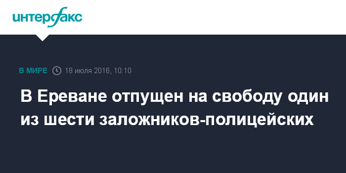 Москва. 18 июля. INTERFAX.RU - Захватившая здание отделения полиции и внутренних войск в Ереване вооруженная группировка отпустила на свободу одного из шести заложников.