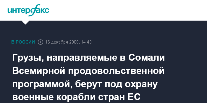 Москва. 16 декабря. INTERFAX.RU - Всемирная продовольственная программа (ВПП) приветствовала начало военно-морской операции Европейского Союза против сомалийских пиратов под кодовым названием "Аталанта".