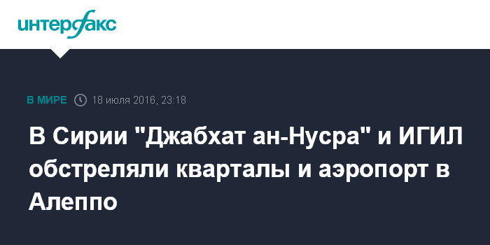Москва. 18 июля. INTERFAX.RU - Боевики террористических группировок "Джабхат ан-Нусра" и ИГИЛ (запрещены в РФ) обстреляли ряд населенных пунктов в сирийских провинциях Дамаск и Алеппо, сообщили в министерстве обороны России.
