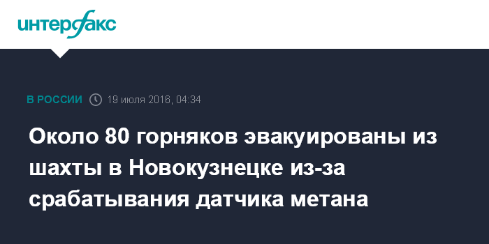 Москва. 19 июля. INTERFAX.RU - Горняки шахты "Юбилейная" в Новокузнецке Кемеровской области вышли на поверхность после срабатывания датчика предельно допустимой концентрации метана, сообщили "Интерфаксу" в пресс-службе военизированного горноспасательного отряда (ВГСО) по Новокузнецку.
