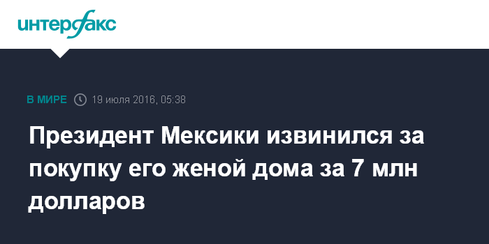 Москва. 19 июля. INTERFAX.RU - Глава Мексики Пенья Ньето принес свои извинения за скандал, связанный с покупкой его женой два года назад дома у правительственного подрядчика за 7 млн долларов, передает BBC.