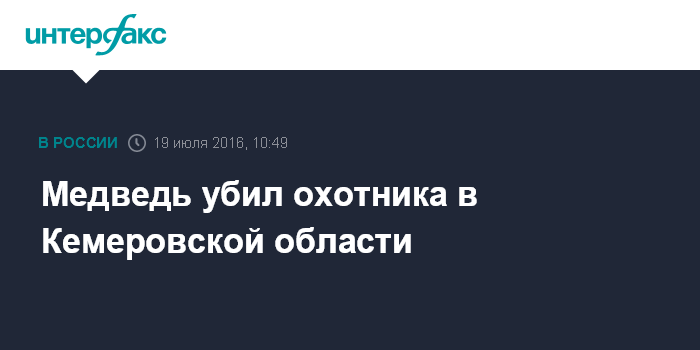 Москва. 19 июля. INTERFAX.RU - Медведь смертельно ранил охотника в тайге близ отдаленного поселка Теба в Кемеровской области, сообщили агентству "Интерфакс" во вторник в пресс-службе регионального СУ СКР.