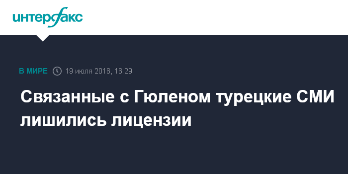 Москва. 19 июля. INTERFAX.RU - Турецкие власти прекратили действие лицензий теле- и радиокомпаний, связанных с оппозиционным исламским проповедником Фетхуллахом Гюленом, сообщили во вторник турецкие СМИ.
