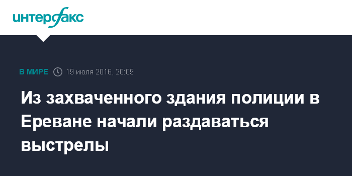 Москва. 19 июля. INTERFAX.RU - Выстрелы прозвучали с территории захваченного в Ереване отделения полиции, сообщает корреспондент "Интерфакса". Захватившие здание и удерживающие заложников вооруженные лица сообщили своим сторонникам, собравшимся близ здания полиции, что стреляли они.