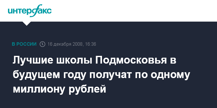 Москва. 16 декабря. INTERFAX.RU - Девять лауреатов конкурса "Лучшие школы Подмосковья" получат в 2009 г. по одному миллиону рублей, а один победитель конкурса - 1,5 млн рублей, сообщили "Интерфаксу" в министерстве образования региона во вторник.