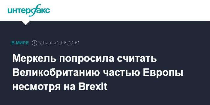Москва. 20 июля. INTERFAX.RU - Германия видит Великобританию частью Европы, несмотря на результаты референдума по Brexit, заявила в среду канцлер ФРГ Ангела Меркель.