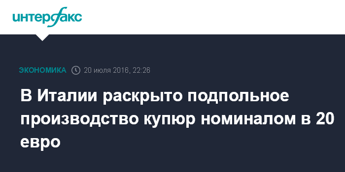 Москва. 20 июля. INTERFAX.RU - Полиция Италии выявила подпольную фабрику, на которой в промышленном масштабе производились банкноты номиналом 20 евро, сообщили в среду западные СМИ.