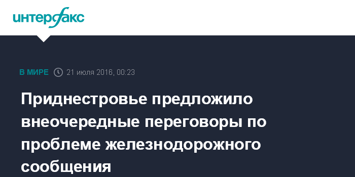 Москва. 21 июля. INTERFAX.RU - Приднестровская сторона предложила участникам переговорного процесса по молдавско-приднестровскому урегулированию провести внеочередное заседание в формате "5+2" по проблеме железнодорожного сообщения, сообщил и.о. главы МИД непризнанной Приднестровской Молдавской республики Виталий Игнатьев.