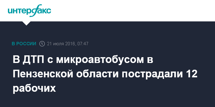 Москва. 21 июля. INTERFAX.RU - По предварительным данным, 12 человек пострадали в результате ДТП с участием пассажирского микроавтобуса в Городищенском районе Пензенской области, сообщили "Интерфаксу" в региональном УМВД.