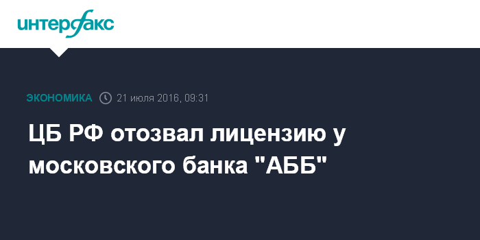 Москва. 21 июля. INTERFAX.RU - ЦБ РФ отозвал лицензию на осуществление банковских операций у банка "АББ", зарегистрированного в Москве, говорится в сообщении Центробанка.
