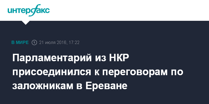 Москва. 21 июля. INTERFAX.RU - Депутат парламента непризнанной Нагорно-Карабахской республики (НКР), генерал-майор в отставке Виталий Баласанян проводит переговоры с членами вооруженной группы, которые захватили в Ереване отделение полиции и удерживают четырех заложников.