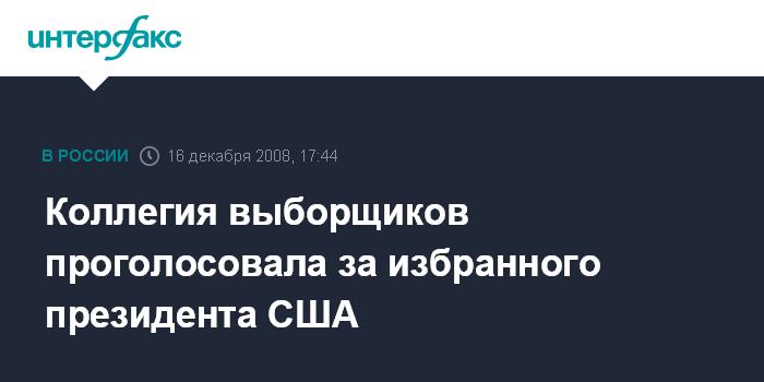 Москва. 16 декабря. INTERFAX.RU - Коллегии выборщиков собрались в столицах штатов США, чтобы официально подтвердить победу избранного президента США Барака Обамы на президентских выборах, сообщила во вторник газета New York Times. За президента США проголосовали 538 членов Коллегии выборщиков.