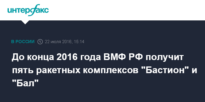 "В настоящее время по дивизиону комплексов "Бастион" развернуто на Черноморском, Северном и Тихоокеанском флотах, в планах на 2016 год - поступление еще пяти комплексов "Бастион" и "Бал", - сказал собеседник агентства, комментируя произведенный сегодня первый учебно-боевой пуск комплексом "Бастион" Тихоокеанского флота.