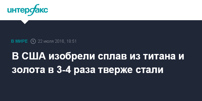 Москва. 22 июля. INTERFAX.RU - Американские ученые разработали сплав из титана и золота, который в несколько раз тверже большинства видов стали, сообщает The Economic Times.