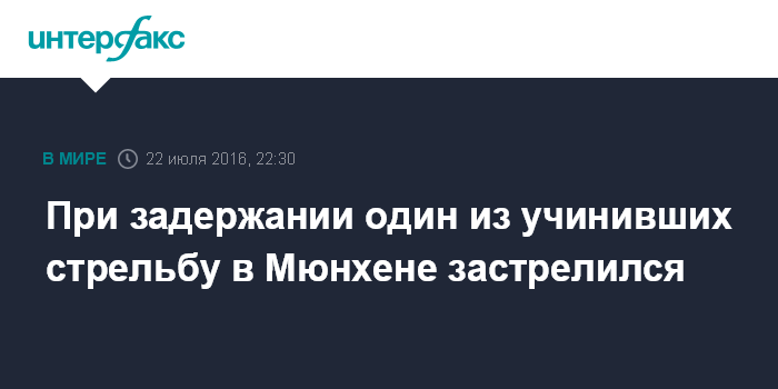 Москва. 22 июля. INTERFAX.RU - Один из преступников, открывших стрельбу в Мюнхене, застрелился при попытке задержания, сообщает немецкое издание Focus со ссылкой на источники в силовых структурах Мюнхена.