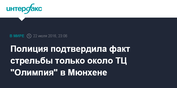 Москва. 22 июля. INTERFAX.RU - Баварская полиция подтвердила факт стрельбы лишь в мюнхенском торговом центре "Олимпия". Выстрелы также звучали на соседних с ТЦ улицах, когда преступники покидали место преступления.