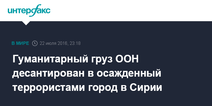 Москва. 22 июля. INTERFAX.RU - Более 15 тонн гуманитарного груза ООН доставлено в осажденный террористами ИГИЛ (запрещена в РФ) сирийский город Дейр-эз-Зор, сообщили в Минобороны РФ.