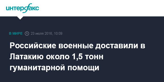 Латакия (Сирия). 23 июля. INTERFAX.RU - Российские военные доставили в сирийскую Латакию около 1,5 тонн гуманитарной помощи для семей погибших и раненых сирийских военных и русскоязычных жителей города, сообщил журналистам представитель Центра по примирению враждующих сторон в Сирии полковник Кирилл Савин.